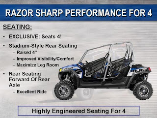 Polaris just released an all new 2010 Ranger RZR 4. With help from Robbie Gordon they have developed another high performance RZR for 4 people. Many have been adding seats to the rear bed on their 2 seater UTV's that allow for 2 additional more riders but that is very unsafe. We could only get a limited number of these and they are on a first come firt serve basis. Retail is $14999....for more details please email Travis Weeks at performanceeast@gmail.com